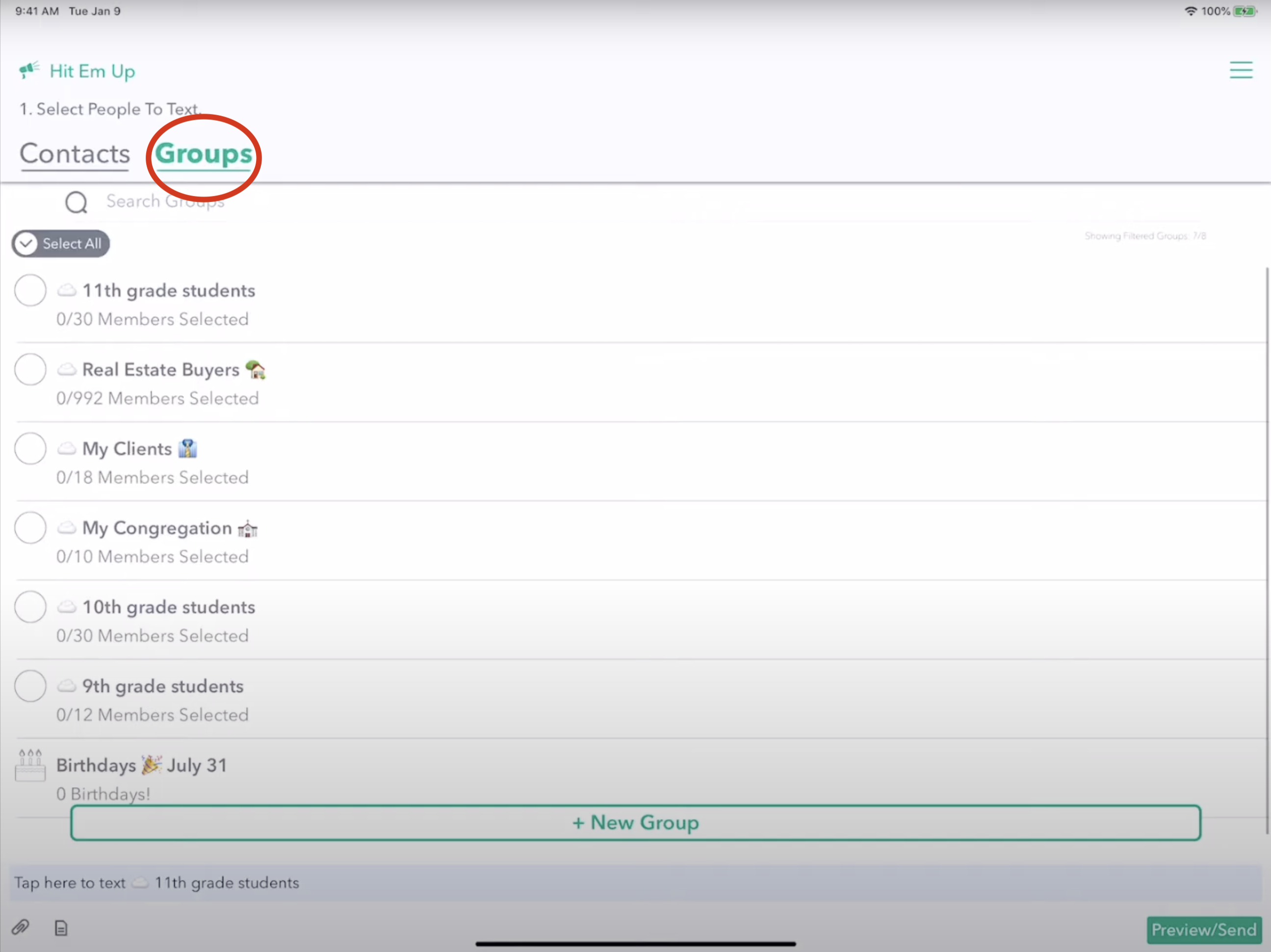 - Tap + New Group to create a new group of people that were going to send personal private messages to. Pick anybody from your list or add new contacts later.